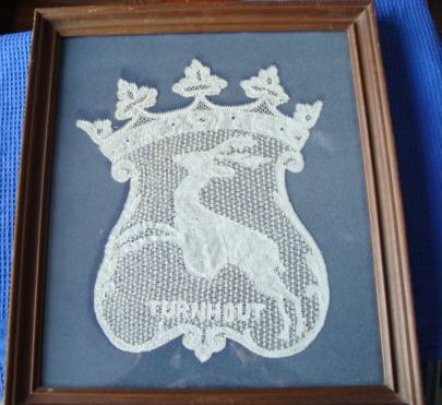 Comments: An armorial piece labled ‘Turnhout’. I assume it was made there. It’s a kind of Flanders with snowflake ground and figural clothwork. Could be a WWI piece, or some later tourist item. Framing kept the condition very good.
