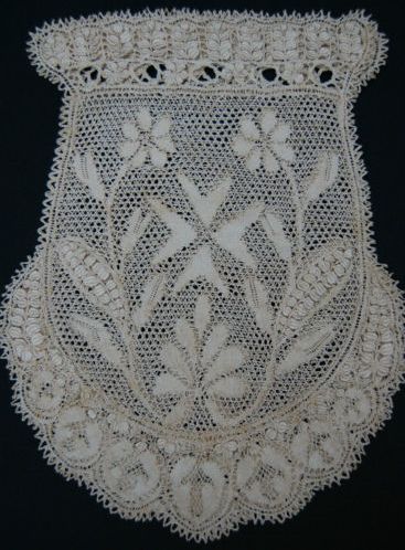Comments: A high quality wide Honiton border. Wish it were longer. The clothwork is tight with good tally fillings. The motifs are quite naturalistic, but the overall design seems a bit off. The bottom seems too large for the top – out of balance. Seller notes some broken brides, otherwise very good condition.