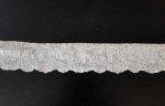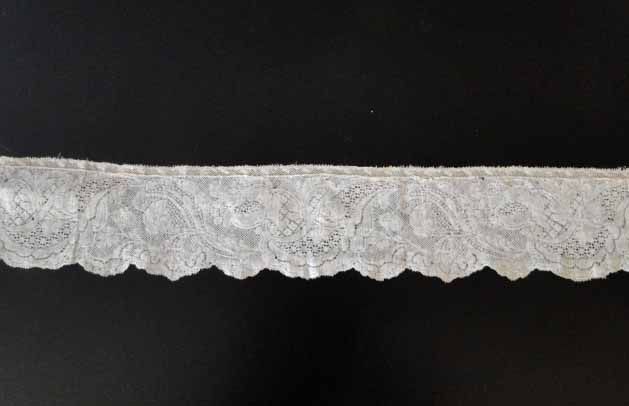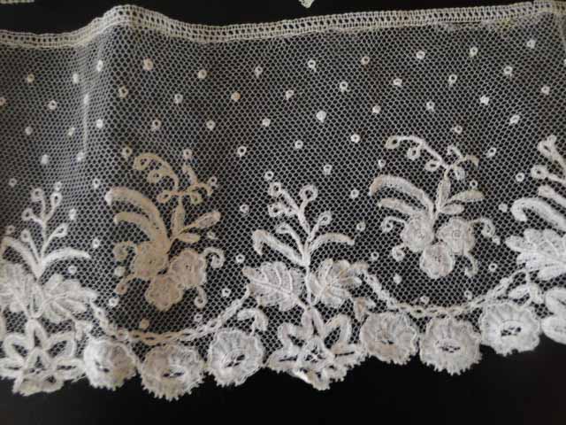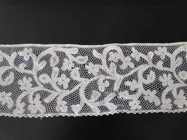 Comments: A narrow border of Brussels bobbinlace application on machine net.  Well-worked small motifs, quite naturalistic. Note the small esprit circles in the ground, sign of a better quality piece. Seller cites a few small openings in the ground, and there might be a little discontinuity along the footer attachment. Overall good condition.