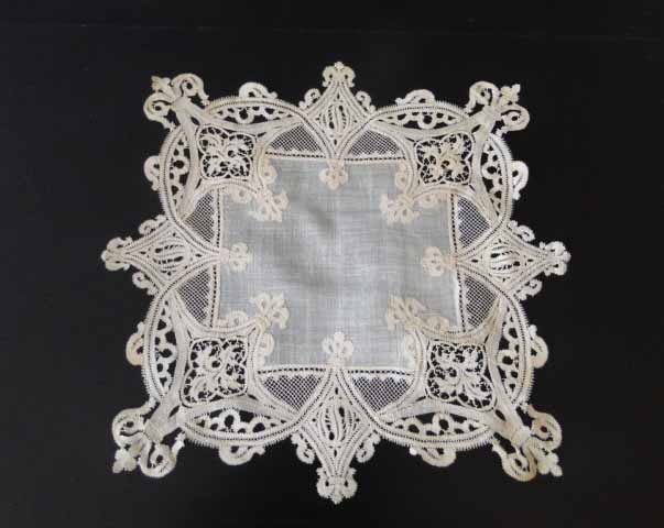 Comments: An interesting Venise handkerchief – work looks Belgian. Good tight clothwork with diamond windows, and ornamented raised cordonnets with loops and picoted edges. Italy is also a possibility for something like this, but I don’t think it would be Burano – but would have to get a much closer look to rule it out completely. Zele in Belgium did this kind of work, but normally in a more figural context. Condition looks very good from the photos, no obvious problems that I can see.