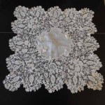 Comments: This is a fun piece, and it’s big for a handkerchief. Note how the motifs go into the center cloth. High quality Honiton, although not much in the way of fillings. Naturalistic design – I wonder what those lozenge shaped motifs are in the points. Square picoted bride ground. Seller cites some marks in the cloth. I don’t see anything wrong with the lace itself from the photos.