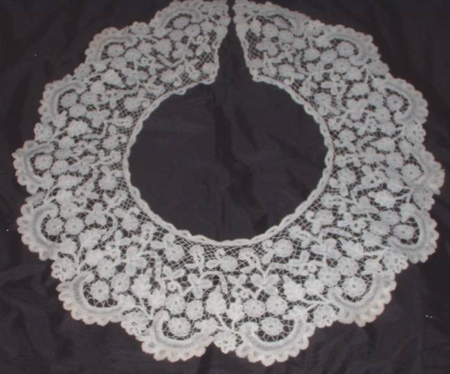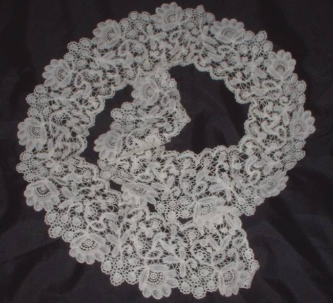 Comments: A nice Bruges collar with square bride ground. At least I think it’s Bruges. The technique isn’t terribly sophisticated, but the work is densely done, and I like the look of the piece. The motifs get a little smaller the closer you get to the neckline. No needlelace that I can see. I don’t see any problems with the condition. Take a look at other pieces this seller is offering, there’s some nice stuff.