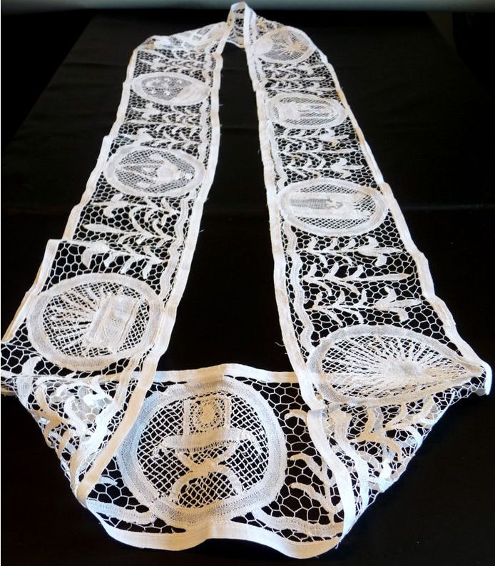http://tinyurl.com/7btgk9x Bobbin lace bottom of a priest vestment- circular with different figures.