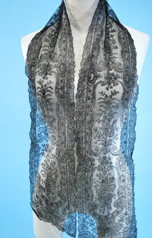 Comments: A narrow Chantilly scarf in very good condition – seller cites a few minor pulls. It is of a very light workmanship. Not quite as over the top as some I’ve seen, but a good example.