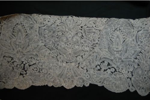 Comments: A good, long length of ‘Brabant’ lace, a bit narrower than one might expect. Actually it’s quite a nice piece. The term Brabant basically places a lace outside of the major manufacturing cities like Brussels and Ghent, although there isn’t any particularly good reason for doing so. And the Brabant geographic region was larger than it is now back in the mid 17th century when this was made. It’s a bit of a derisive term, and sometimes people try to pass it off as English, again without really good reason. This design of this piece is a bit haphazard, and the work itself a little loose – all characteristics of this lace. It also doesn’t have any mesh ground, which is more on the Brussels side, and might point to a slightly earlier date. The piece is a kind of halfway between the really good Brussels products and the ‘Brabant’ style. Condition looks very good from what I can see.