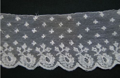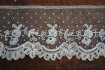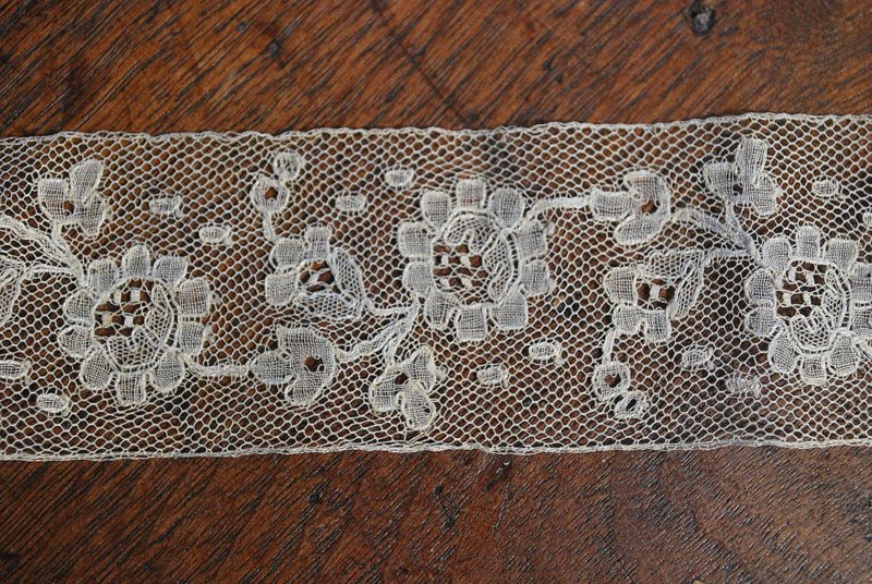 Comments: A good length of a narrow Brussels bobbinlace applique on machine net. The motifs are delicately made, with round esprits in the net. No needlelace that I can see. Condition seem very good, I don’t see any problems. That’s unusual for a piece like this.