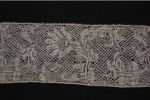 Comments: A Rosaline (n perls), narrow border. It’s a little unusual to find this lace in border form, more often it is made in specialized pieces. This one has a good dense design with some ropey raised work. Seller cites a few stains, otherwise very good condition.