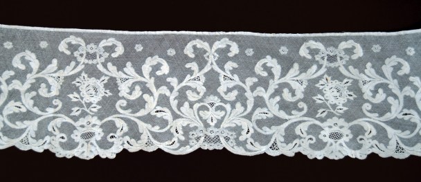 This remarkable point ground lace is an alb flounce, and comes with two matching cuffs. They might also be used to decorated a dress. We recently mounted the set on a linen alb to get an overall impression, although the alb itself is probably a bit too long. It is a point ground continuous lace, about 10″ wide. The thread is linen, a bit coarse and stiff, but the work is excellent. Note the lack of a gimp, the well-done fillings, and raised veins from sewings within the motifs. Point ground laces in the Aquila region generally fall under the name ‘Punto Antico Aquilano’ as discussed literature such as Rita Fattore and Vita Maria Aprile’s “Il Tombolo Aquilano”, 2008. This is not a readily identifiable lace, and I think there are many mistaken attributions. It is a worthy topic of research. But the Italian provenance of this particular set is undisputed.