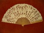 Comments: A Brussels Duchesse fan with nicely carved blonde sticks. The lace is in very good shape. The needlelace insert is a bit unusual, no raised work, and some different flowers. The bobbinlace motifs are nicely done, but a little large, giving the piece a bit of a clunky look. I don’t see any condition problems in the lace.