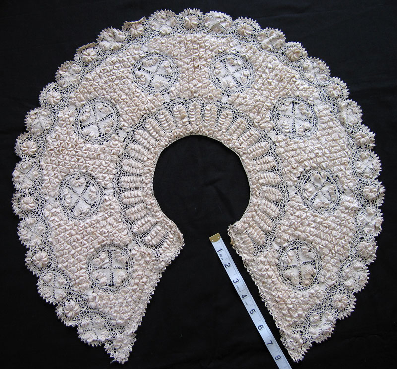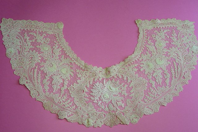 Comments: A Duchesse de Bruges shawl collar, basically no needlelace. Some nice raised work in the bobbinlace motifs, which are well done. The whole thing has a beautiful presence. Condition is very good, I can’t see anything wrong.