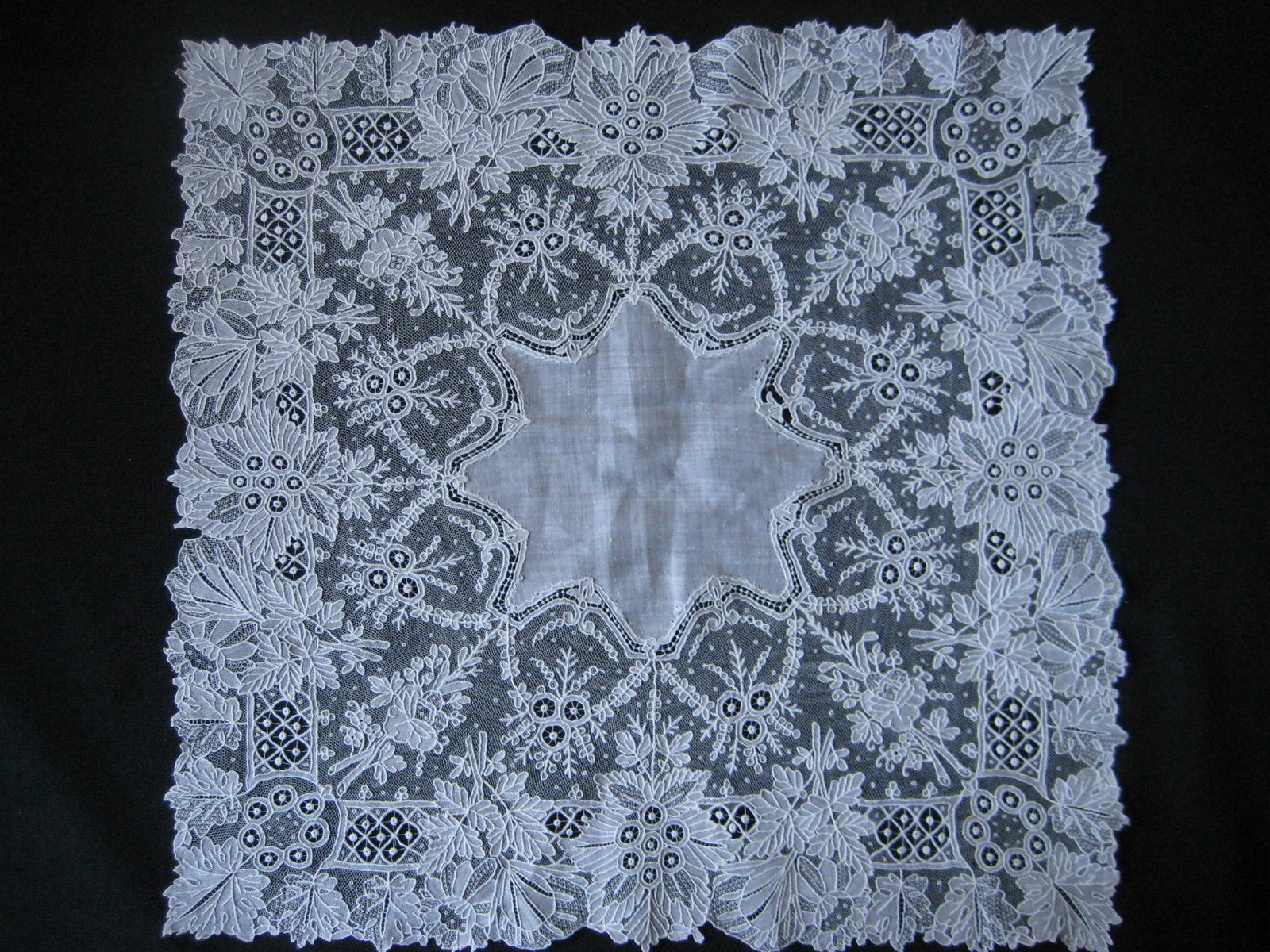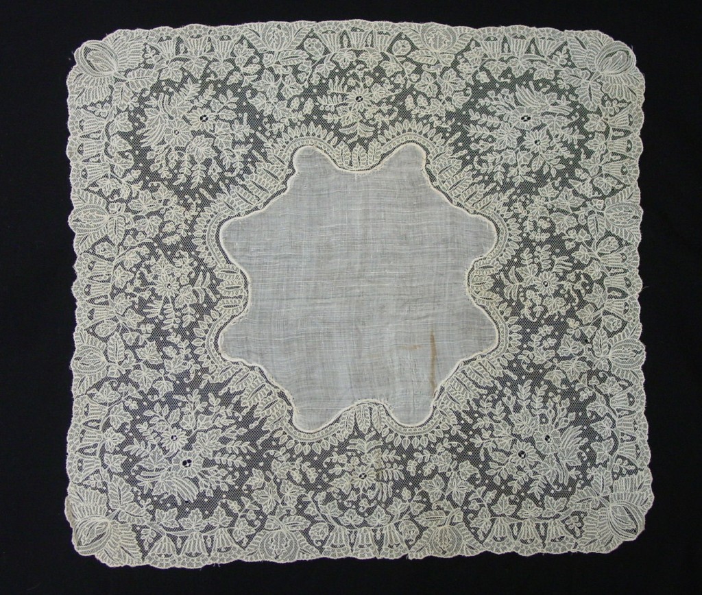 Comments: An extremely fine embroidered net handkerchief. Work is so good that it looks like bobbinlace from a distance. Some staining in the center cloth, otherwise very good condition.
