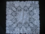 Comments: A Point de Gaze handkerchief, nice contrast with the preceding piece. This one is more typical of the raised petal rose design, and the jours are more varied. A good, romantic design. Condition is good, note some small holes in the ground.