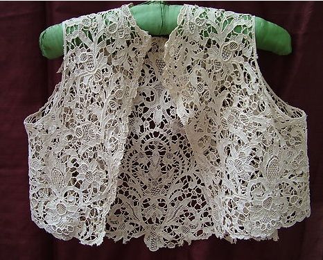 Comments: An interesting little jacket of Point de Venise, probably Belgian. The wide spacing on the cordonnet buttonholing is usually the giveaway. Fillings are basically clusters of 3 twisted buttonholes, and there’s a picoted bride ground. No shaping to the raised cordonnet. It’s not the greatest 19th-20th c Point de Venise I’ve ever seen, but it is well designed for the purpose and I like the overall effect. A little frayed in places, and something seems to be missing along the bottom.