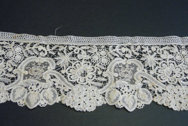 Comments: A Brussels Duchess border I like the work on the large bobbinlace flowers and the masses of buds along the lower edge. Other parts are a little looser at the top. The Point de Gaze inserts are simple flat flowers with a few buttonhole rings. Note the good raised work in the bobbinlace leaves at the bottom of the piece. Condition is good, one major tear shown in the bottom photo.