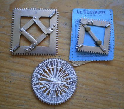 Comments: These little metal looms are for Teneriffe lace and are fascinatingly complex. Having tried a few, they don’t work quite as well as they might, but who cares. They were often marketed through the Grands Magasins du Louvre. These don’t seem to have any rust, which is important. Original backing with one, unusual.Their use is described in “La Dentelle de Ténériffe by Cousine Claire, who shows 15 different sizes for these looms.