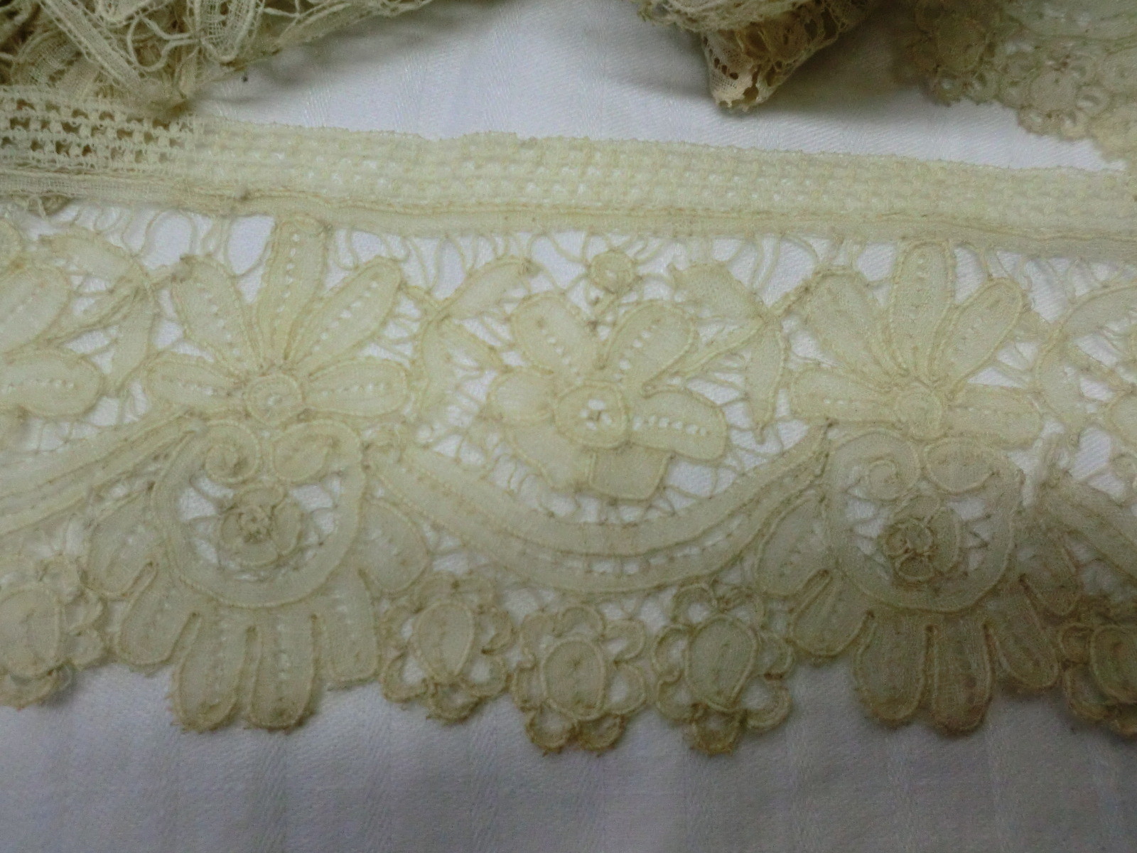 Comments: A Duchesse de Bruges border, very long. Not a good idea to photograph your laces on light backgrounds – every defect jumps out. This piece is notable for the length; the design is a standard middle market product. The lace looks intact from the photos, but there there is overall discoloration and some dirt spots.