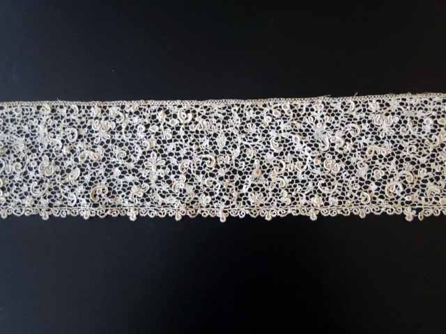 Comments: Another long, early piece, almost a Point de Neige but not quite exuberant enough. The work is excellent with beautifully sculpted cordonnets. Point de France has a more regular design, than Italian counterparts, often with a hexagonal picoted mesh.The lower edge looks fine on this piece, the upper may have been cut – hard to tell without more details. Some reattachment needed, and a little damage to the foot edge, but overall very good condition.