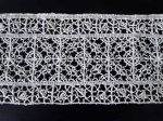 Comments: A Brugges Duchesse border, with fairly large motifs. Simple repeat, no raised work. Definition relies on the manipulation of a heavy gimp. It’s not meant to be a delicate lace, and I think it succeeds quite well. Seller notes age discoloration and some broken brides, but overall good condition.