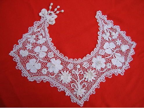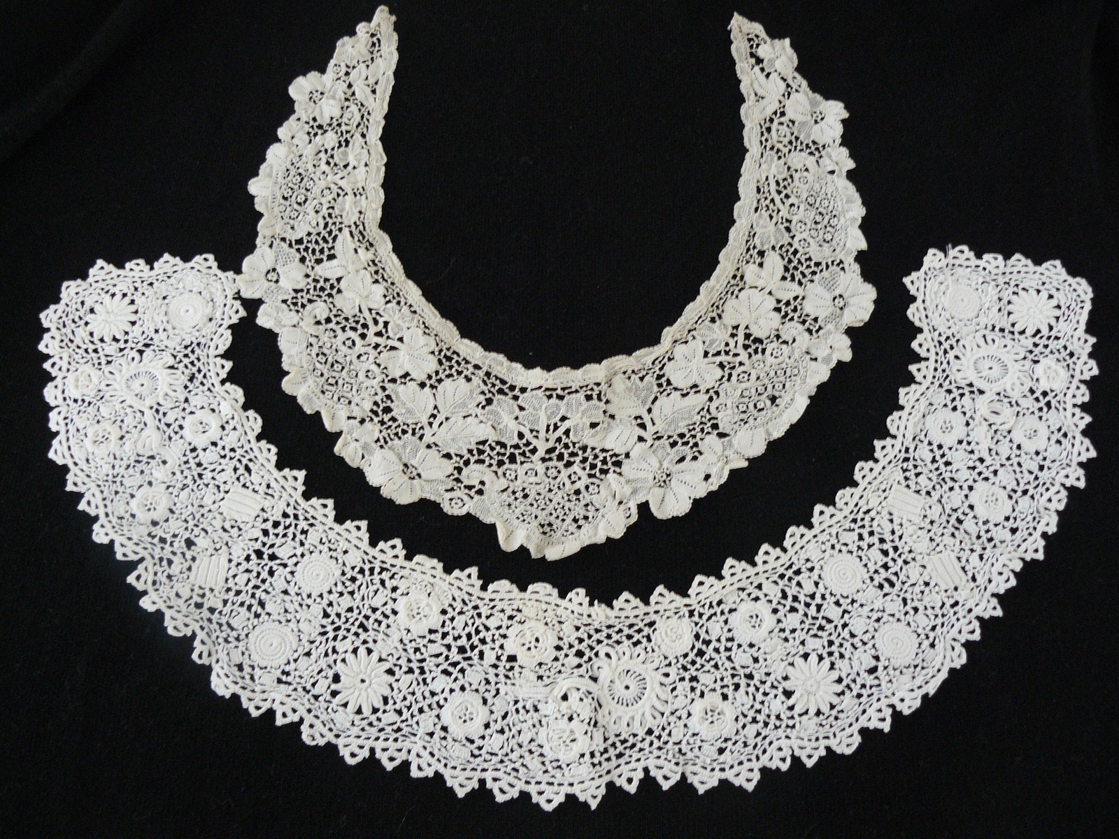 Comments: The Youghal collar is the more interesting piece, although the Irish Crochet does have some nice raised work. It does look a little amateurish, not very tightly worked. The Youghal motifs are a little coarse, and the fillings a bit clumsy. But I like the shamrock designs. Condition is a bit problematic in the Youghal, a few holes, and some wrinkles that might indicate past washing. Not sure about that.
