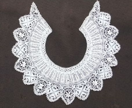 Comments: A nice looking Bruges collar with fairly large motifs. Note the little spiderweb patterns where several brides meet – a definite characteristic of Bruges. Condition appears very good.