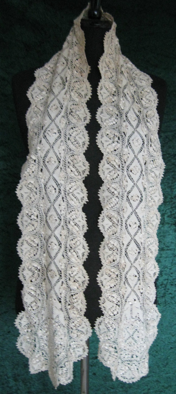 Comments: Haven’t seen this seller in the lace marketplace for a while. A Maltese lappet scarf of good design with some nice guipure work. The clothwork is extensive in the center parts, unusual. Condition appears very good.
