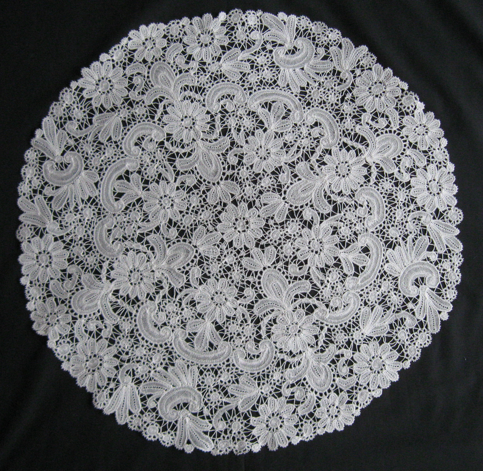 Comments: A Duchesse de Bruges round mat – quite an unusual form. The lace is nicely done, and the overall effect is interesting. Seller indicates the piece has been washed, and I don’t see any condition problems from the photos.