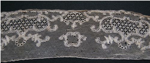 Comments: A large piece of Rosaline considering the delicacy of the motifs. No perls, but some raised work along motif edges and to better define flower centers. The design seems a bit scattered and the work a little loose for this kind of lace. It does have good left-right symmetry. Condition is very good, seller notes some age discoloration.