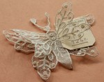 Comments: When Point de Gaze butterflies are swarming, the price goes down. When you haven’t seen one for a while, like here, prices goes up. The survival of the tag is unusual, Aux Trois Quartiers, Paris, and it says it comes from Belgium. These were basically early 20th c tourist items. This one is a little plain, double wings with a little raised work, and shading using ground and cloth stitch. Condition a little wrinkled but basically good – I don’t see any holes or pinpricks.