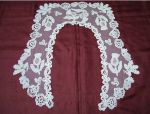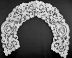 Comments: This seems to be bertha week. One note on the photography, some of the manufacturers of these pieces photograph them just like in the photo but with the ends trailing downward a bit (like the ends of a jabot). This is Duchesse de Bruxelles, with flat needlelace inserts, and good raised work on the bobbinlace. It works with rather standard motifs a bit thrown together but with a pleasing flower-garden effect. The condition is excellent, which is unusual.