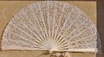 Comments: A Duchesse de Bruges fan with carved and pierced bone sticks. The lace has rather typical Duchesse motifs, quite well done. Usually you see these with MOP sticks, so this one is unusual, and the whole effect quite nice. Seller indicates the fan is in very good condition – it has been box-framed which protected it well.