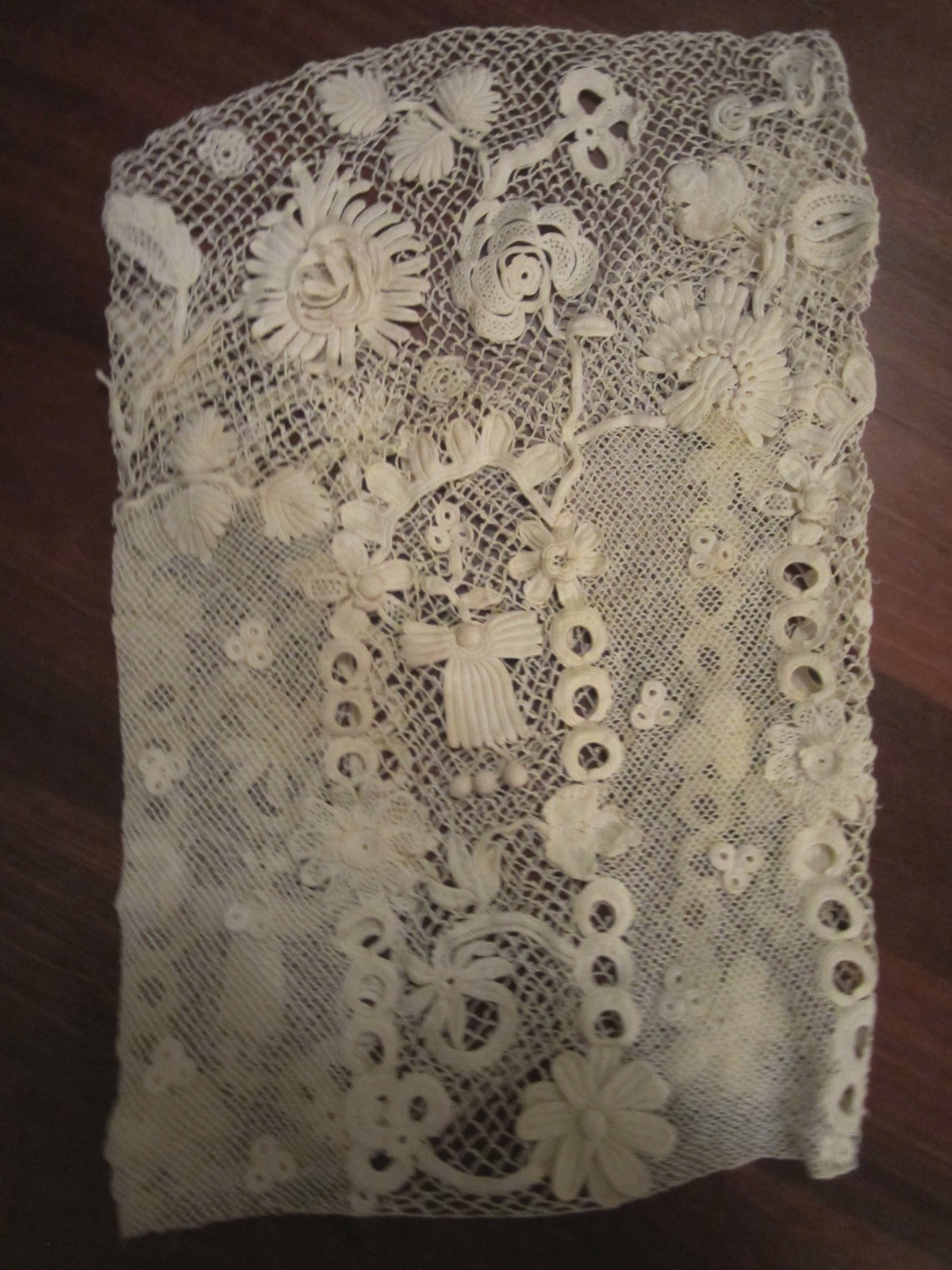 Comments: I don’t know what it is either – maybe a sleeve? Might be able to undo a seam somewhere and lay it flat. The motifs are innovative and nicely worked. Good raised work and 3-d attachments. Note the regular square mesh, no picots, unusual. Condition appears very good, I don’t see any problems from the photos.