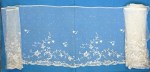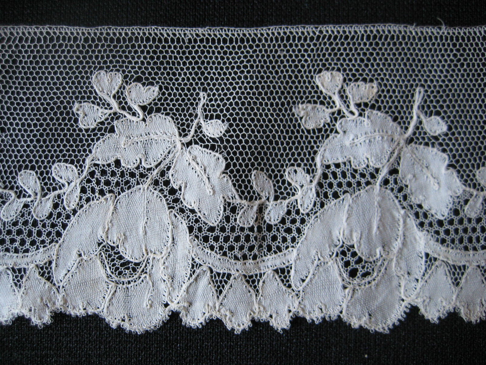 Comments: A Brussels Application on machine net, long and wide. The delicate bobbinlace motifs are sometimes filled with net embroidery. Some small dots in the ground. Condition is good, although uncertain through the whole length. Some areas of well done repairs to the machine ground, and a few pulls in the net. Someone took good care of this piece.