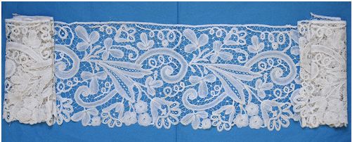 Comments: A Bruges bobbinlace border, interesting design and well executed. The clothwork is very even and nicely done. Seller cites a few broken brides, and there’s cutting and joining, but overall good condition. I like this blue background for the photos.