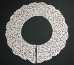 Comments: An Irish Crochet collar with a shamrock, flower and kind of snowflake motif of rings. It’s a bit of an assembly job without much thought to symmetry, but it has a nice overall look. Some staining especially on the neck edge, otherwise very good condition.