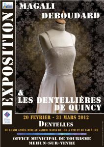 A shorter exhibition, “Magali Debouard & Les Dentellières de Quincy” runs from February 20 to March 31, 2012 at the Municipal Tourism Office in Mehun-sur-Yèvre. Mme. Magali Dèbouard is a professional local lacemaker, http://www.dentelledemagali.com/.