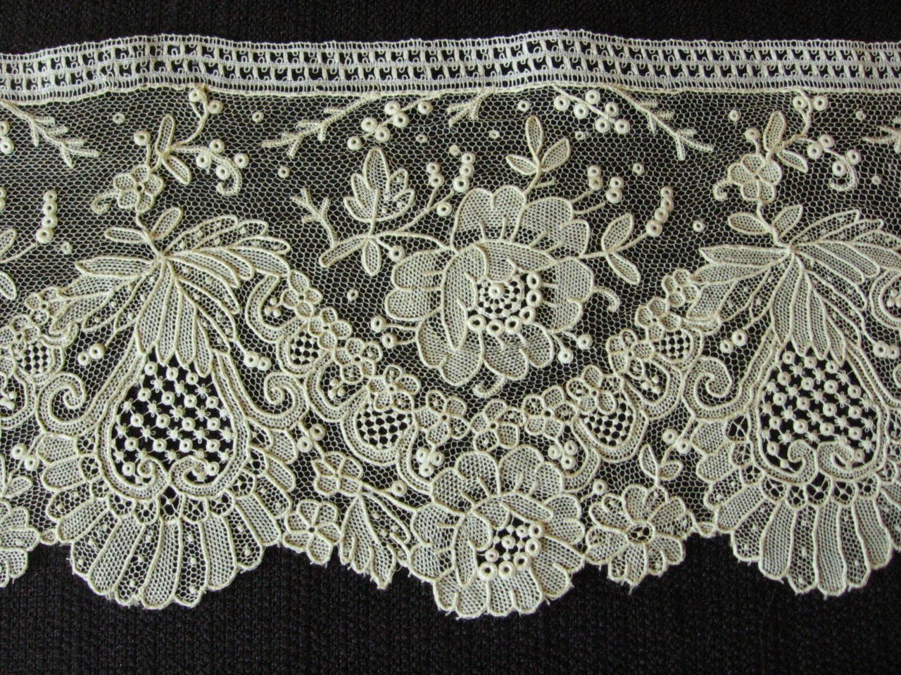 Comments: Note, this piece and 160752208051 look the same, have the same measurements and descriptions, but different prices. I’ll write to the seller for clarification. It is a good, dense design Duchesse de Bruxelles, with flat needelace flowers in diamond shaped inserts. All work looks very good, and the condition appears excellent. Has provenance.