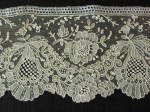 Comments: Probably 2nd quarter 18thc border, I’d call it Valenciennes with a 5-hole ground. Not untypical for Val at this period, when lacemakers experimented with several different grounds before settling on the round-hole mesh. There is some nice shading of the motifs. The picoted edge is a later addition – hard to tell if it’s been cut down. The swirling design seems complete, but maybe a little truncated on the picot edge. A few small holes and some fraying, minor. One join.