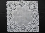 Comments: A Duchesse handkerchief, no needlelace. Note the well defined motifs, with good raised work defining the veins and flower petals. Each motif is a well-made product in itself, with the design through into high relieve by the very simple, open bride ground. It almost has a Ghent flavor. The condition is very good – looks fresh from the pillow.