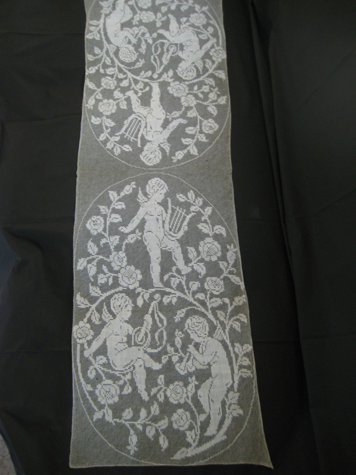 http://tinyurl.com/7p2hp6o ANTIQUE LACE 17″ X 64″ FILET LACE PANEL WITH PUTTI, HORNS OF PLENTY AND GODDESS