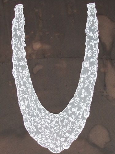 Comments: A Point de Gaze shawl collar. The lace is flat and nicely done with interesting fillings. Good naturalistic design. The condition appears exceptional. I see a few tiny pinholes in the net, but negligible for a piece of this quality.