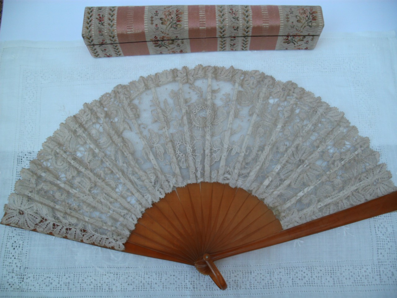 Comments: Great box. Cool sticks, nicely intact. A Brussels Duchesse fan leaf with one major Point de Gaze insert in the center, raised petal rose. The bobbinlace is a little conventional, but I like the contrast with the large area of needlelace. Condition looks very good, I don’t see any problems. Needs a darker ground for the photograph – photographing white pieces on a light ground sharpens every little defect and often gives a piece a dirty look that isn’t really there.