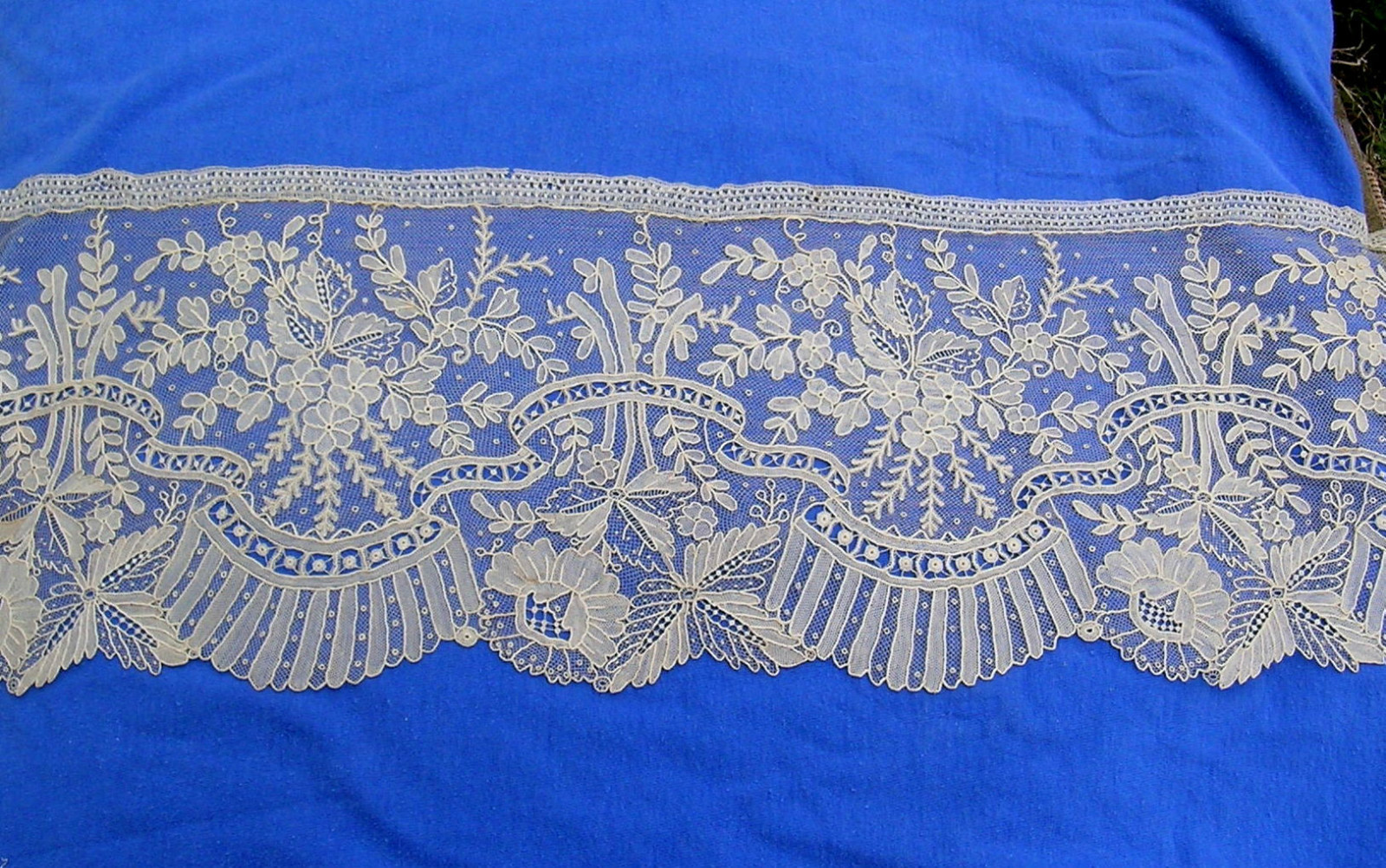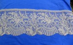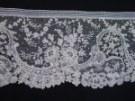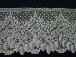 Comments: This is not Duchesse, it’s a lovely Point d’Angleterre piece, later 19th c. Delicate bobbinmade motifs with Point de Gaze mesh, extensive needlelace fillings. One of the very best Belgian laces. The quality of this kind of lace can vary a lot – this one isn’t the absolute top quality, but definitely a high end product. And finer than it looks; keep in mind it’s only 6″ wide. Condition is very good, I don’t see any problems from the photos. It’s a beautiful, collectible length.