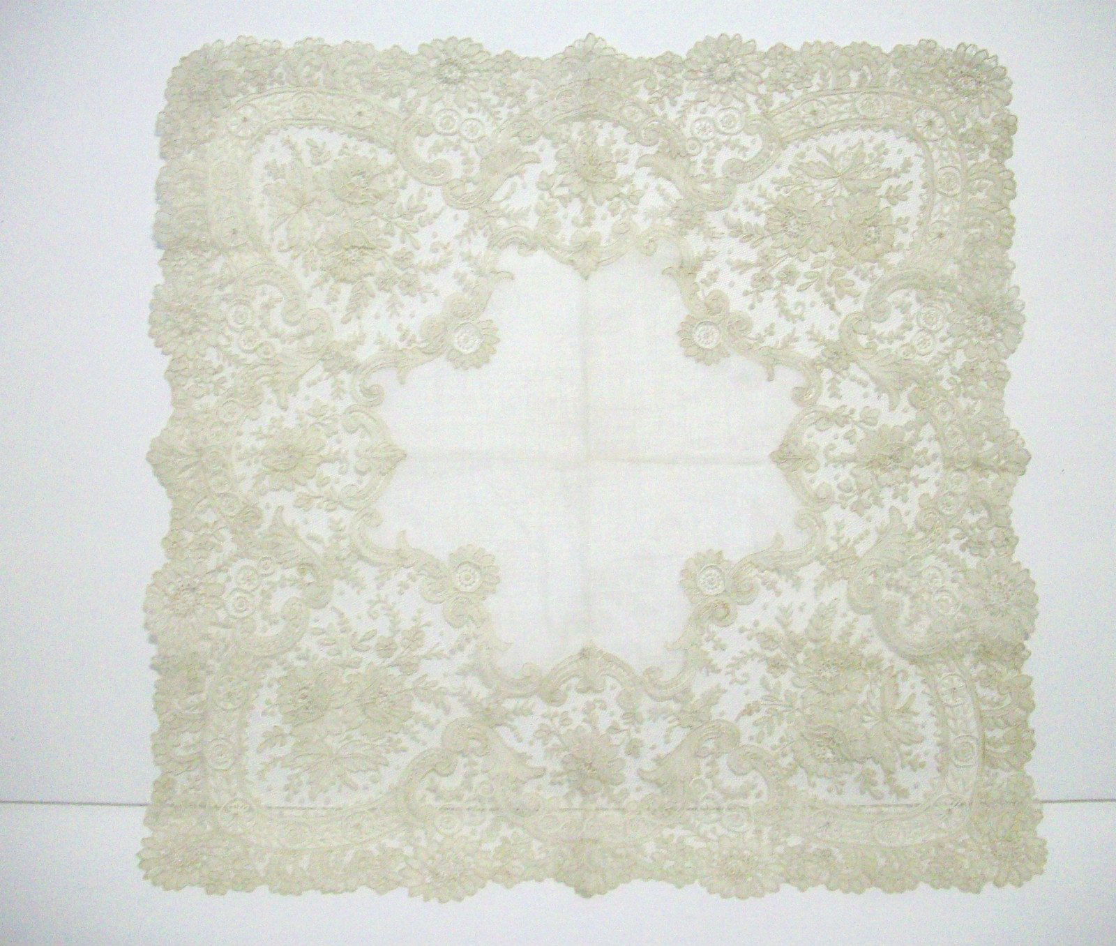 Comments: The light background of this photo makes it very hard to see the lace, and also makes it look dirtier than it probably is. It is a Point de Gaze handkerchief with I think some raised petal roses, hard to tell. Definitely a higher end market piece, and the condition is probably very good. Seller says unused, but it’s hard for me to offer an opinion again because of the light background. Some nicely done fillings, and I think the edge picots are connected, which is the mark of a particular although unknown manufacturer.