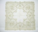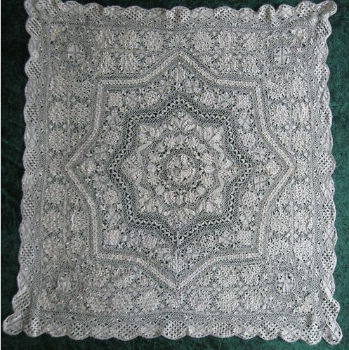 Comments: A small square Maltese cloth with a central star pattern. Note the alternating Cross and woven leaf grids around the center – this is echoed in the internal designs. There is some more ambitious guipure work near the center. A few loose threads and pale spots, overall good condition.