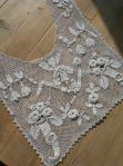 Comments: A Honiton dress front with attached standing neckpiece. Snails/slugs design with an unornamented bar ground. What I find interesting about this piece, and I’ve seen it before, is that there appears to be two rows of machine made tapes just inside the collar. Condition is a little strained, a few detached brides, and a curved motif gone wrong at the lower right side of the frontpiece. Nothing particularly serious.