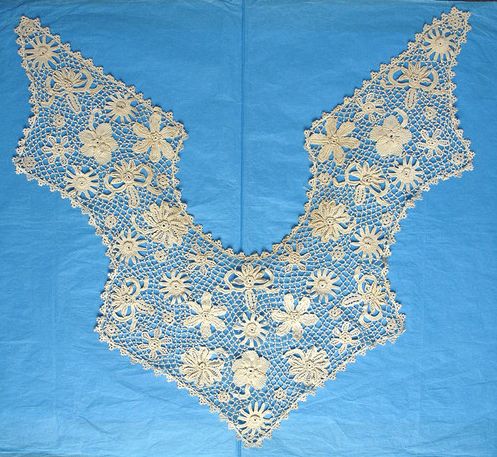 Comments: Wish there were better closeups here. I like the interesting motifs that stand by themselves, breaking away from the trefoil connection so often seen in Irish Crochet. Note the square picoted ground, probably not Clones knots, but no photos close enough to really tell. The motifs are nicely worked with some raised work. Some stains along then neckline, otherwise very good condition.