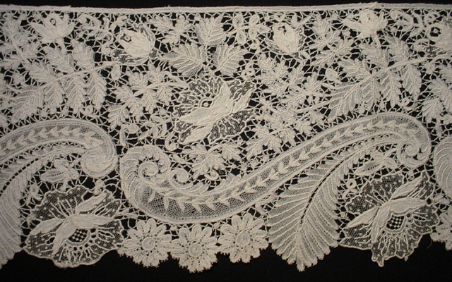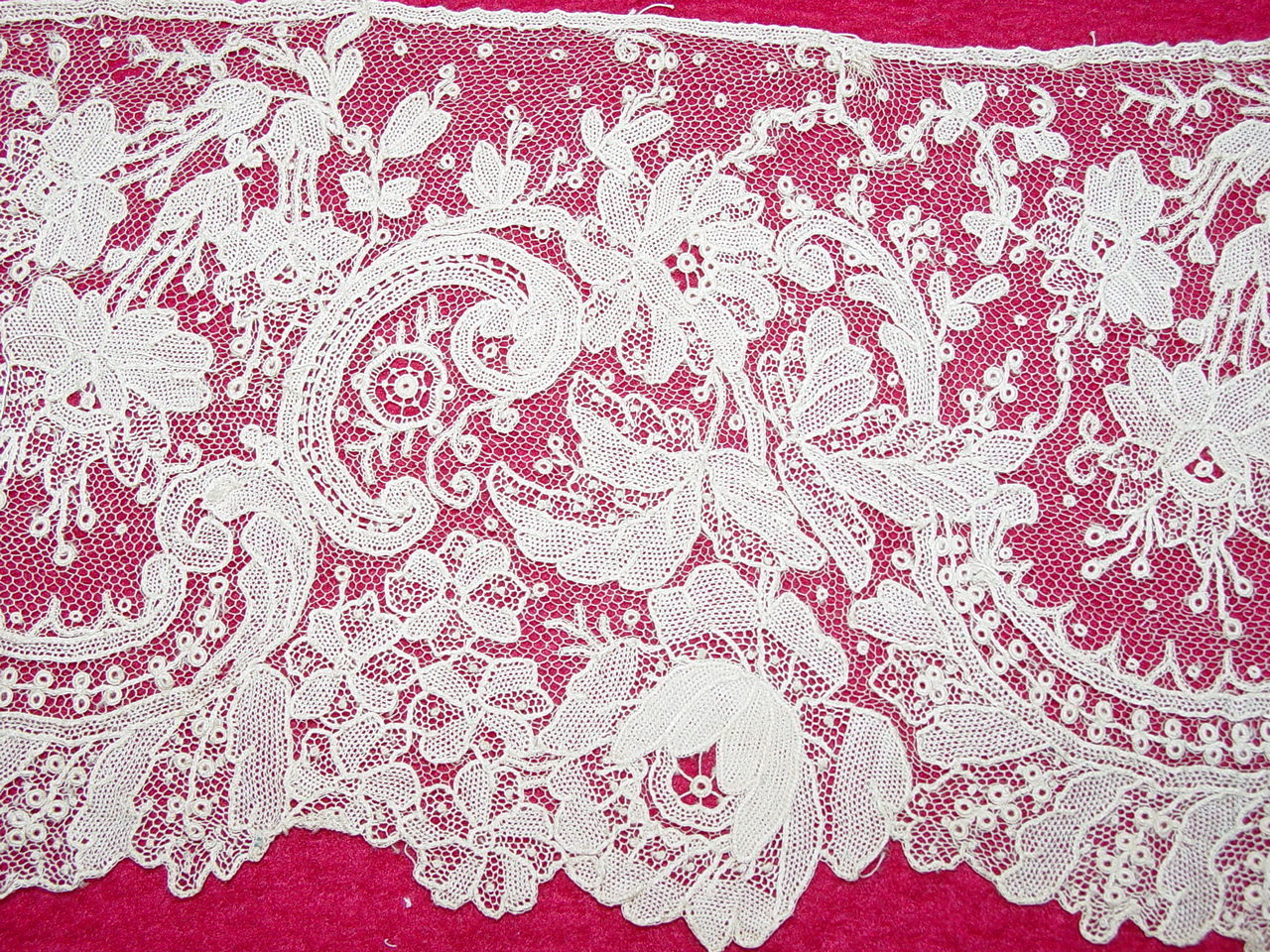 Comments: A very nice piece to end with today. Brussels Duchesse, in a non-standard, beautiful design. Note how the Point de Gaze roses (with pointed raised petals) sneak into the design. The scrolls and lower leaves have so much movement that I’d hate to ruffle this piece for fear of hiding the flow. Good raised work on the bobbinlace. Very minimal condition problems. Definitely an upscale market piece.
