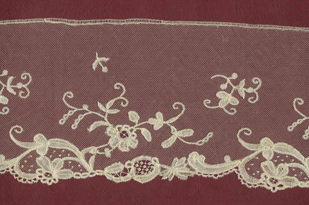 Comments: You see lots of Valenciennes borders, even very wide ones, but relatively few shaped pieces. This lappet tie is nicely done, square ground, but not too ambitious a pattern. It looks in very good condition.