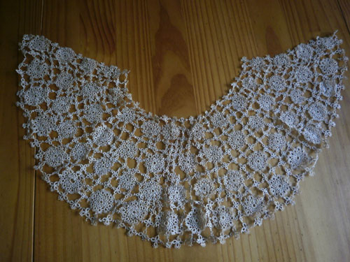 Comments: A tatted collar, with motifs all tied together. I love this kind of lace, it has a freedom that is quite unique. I don’t mind the knots at all. Modern tatters have abandoned this approach, but I think they should take another look. Condition looks very good, I don’t see any major problems. I do wonder if it was finished on the ends, they look a little abrupt.