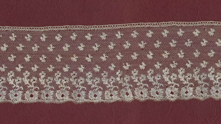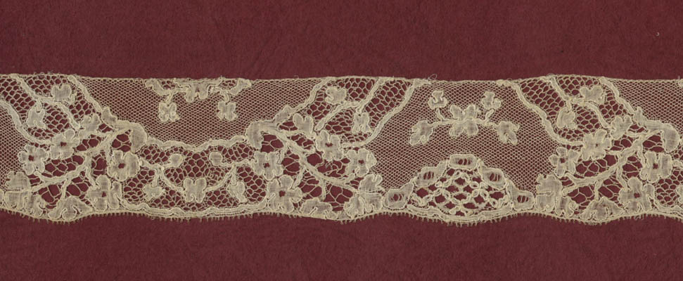 Comments: A narrow Mechlin edging, probably early 19th c. I think someone has added a machine picot edge – this was often done to ‘modernize’ older laces. I don’t know the condition of the real edge. It’s a light design with lots of sprigs in the ground and a series of flowers along the border, meant to be ruffled. Some holes in the ground, a few spots, but fairly good condition.
